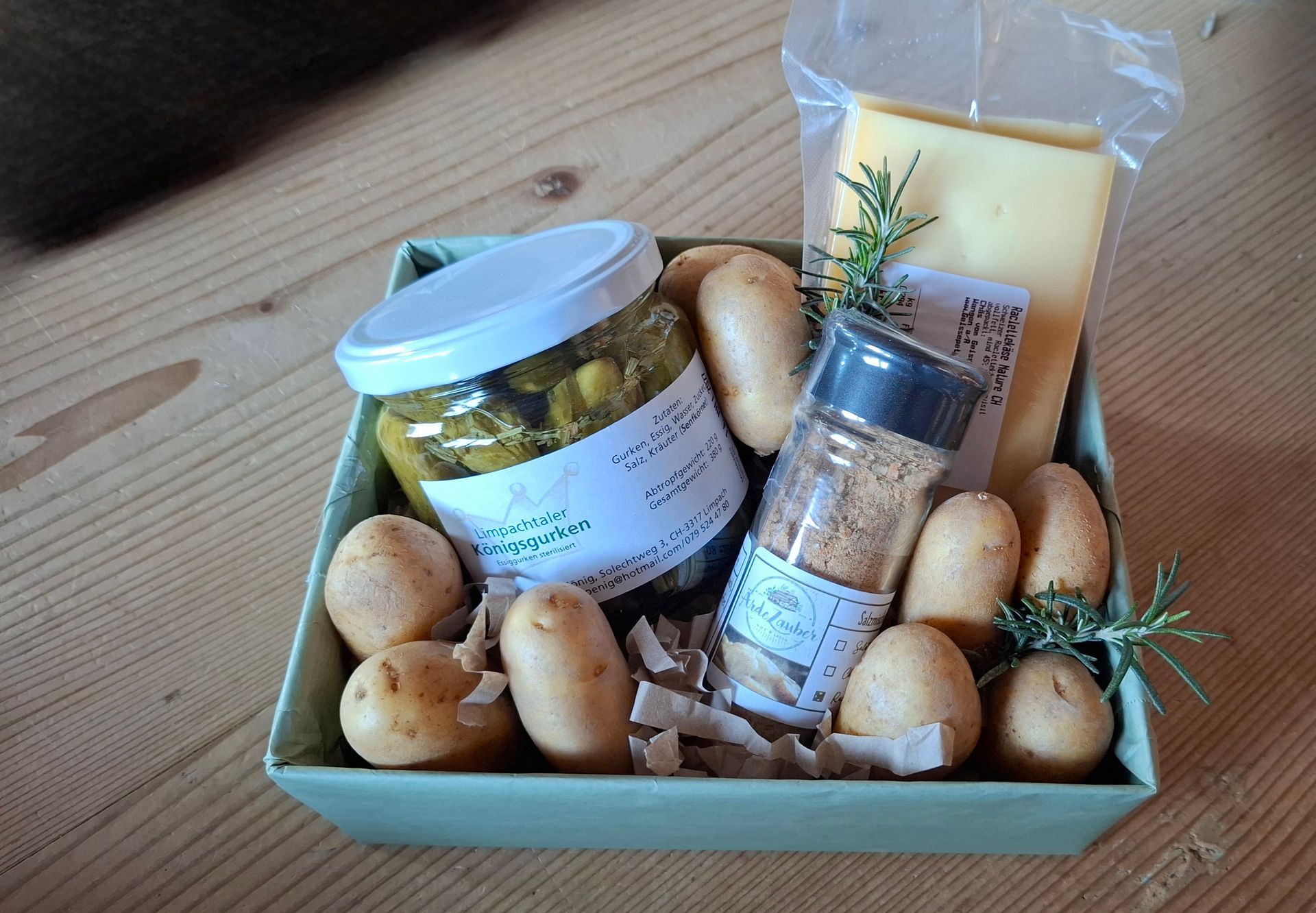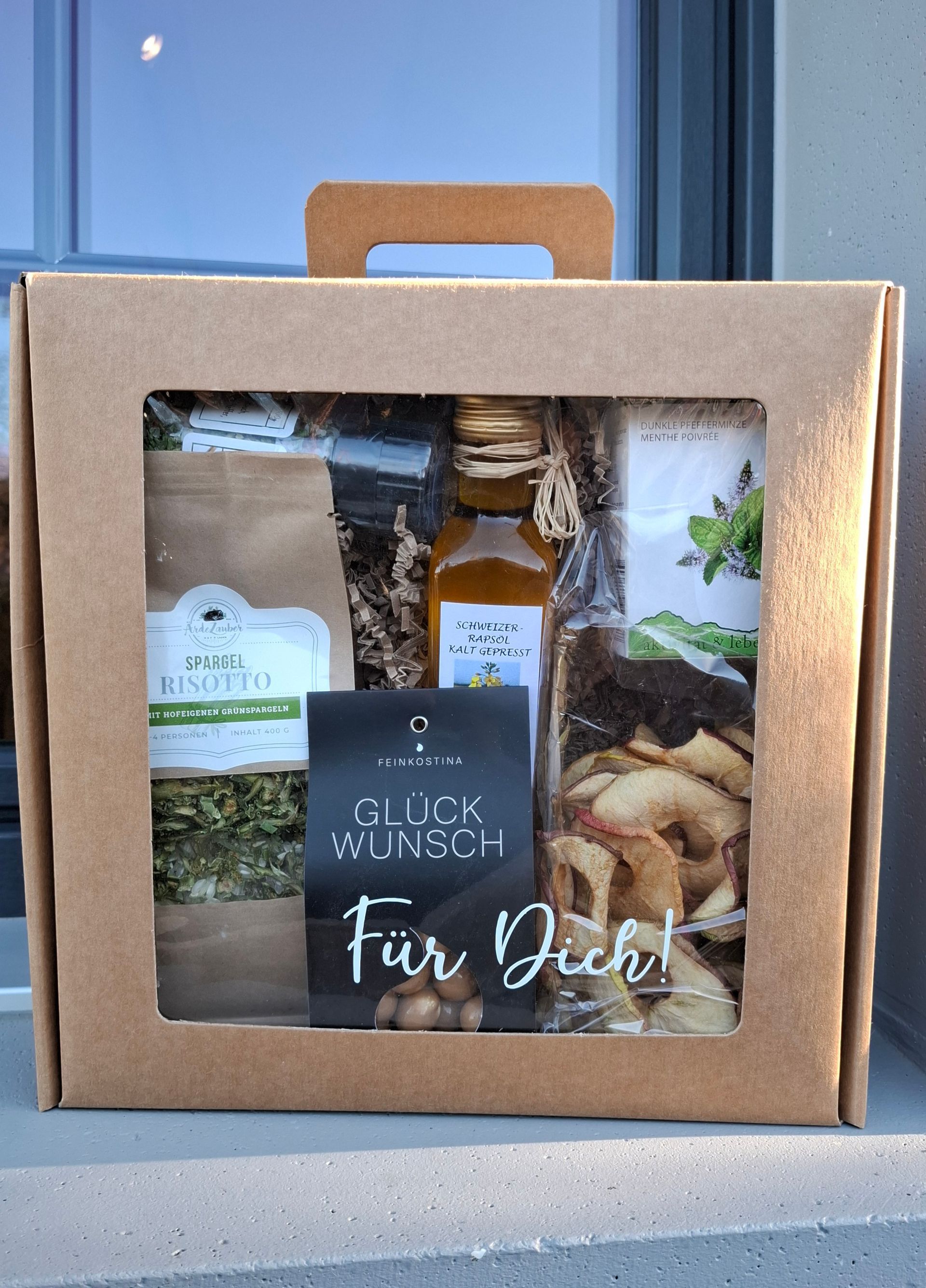 Verschenke unsere einzigartigen mit Liebe hergestellten Geschenkkörbe natürlich verpackt im Steingutgeschirr, im Holz Optik Kartonkorb oder im Brotkörbli, alles ist möglich. Sie entscheiden, was wir zusammenstellen dürfen. Sei das mit unseren natürlichen erlesenen Produkten aus unserer Hofmanufaktur oder regionalem Anbau, wunderbar würzigen Wurstvarianten, Bergkäse, oder unseren herzhaften Risotto-Mischungen. Mit frischem saisonalem Gemüse und Obst werten Sie jedes Geschenkset zusätzlich auf.